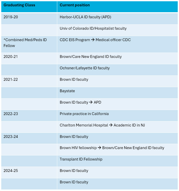 Brown ID Fellowship Mission Statement: The Brown University Infectious Diseases Fellowship provides comprehensive training in the field of infectious diseases including patient care, the art of being a consultant, diagnostics, responsible use of antimicrobials, preventing transmission of infectious diseases; and provides career and research mentoring to the next generation of infectious diseases physician-scientists, clinicians, and clinician-educators.